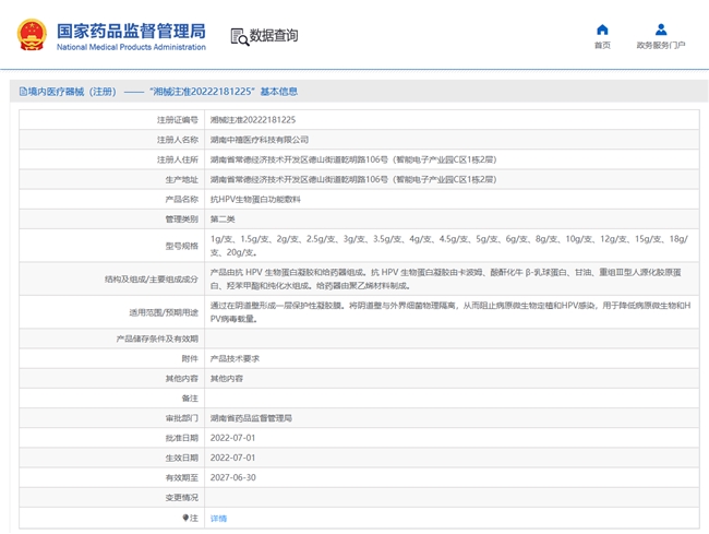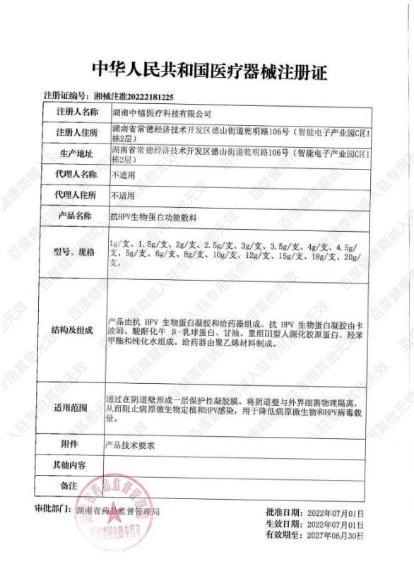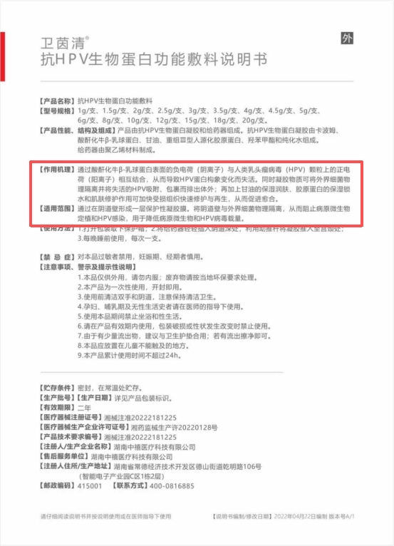 我们在查询卫茵清这个品牌的官网和各大电商网站后发现,卫茵清抗HPV生物蛋白功能敷料,属于在国家药监局备案审批过的正规国家二类医疗器产品,它的医疗器械注册证编号为:湘械注准20222181225